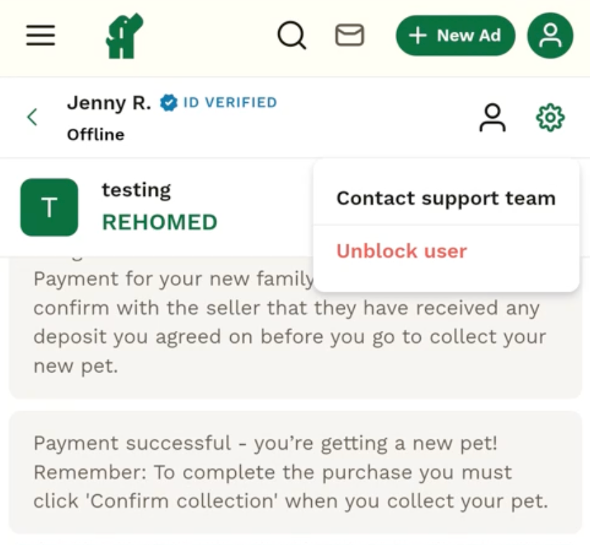 We have many measures in place to ensure our chat is a pleasant, safe, and happy space where people can discuss the rehoming of a pet. However, you may wish to block a particular person from contacting you.